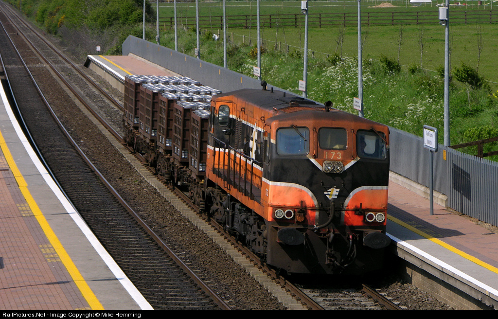 | 173 is seen passing Garmaston (north of Dublin) working a Liner train from Dundalk to North Wall. This was one of the last services transporting Guinness by rail as Irish Rail stopped moving beer by rail later in 2006 |