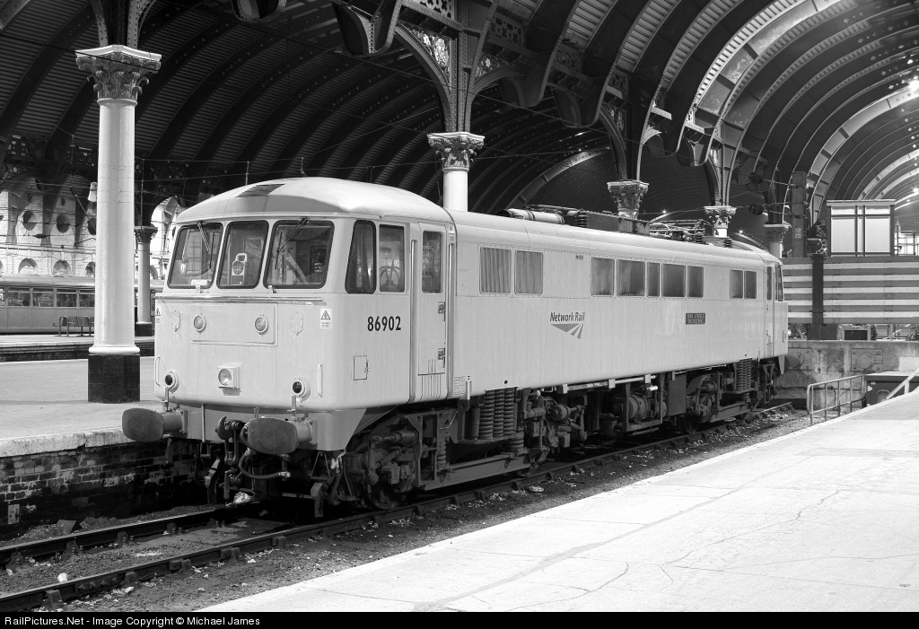 Network Rail's 86 902 sits idle in the dock platform at York one foggy evening in February.