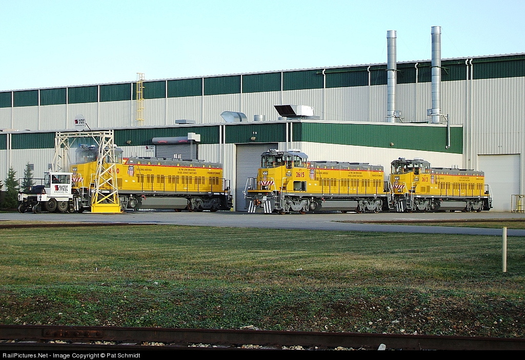 | Brand new Union Pacific RP20BD's 2610, 2613 and 2615 are shown in front of Super Steel in Scotia, NY. Super Steel's Trackmobile is seen to the left pulling the 2610 through the wash rack. |