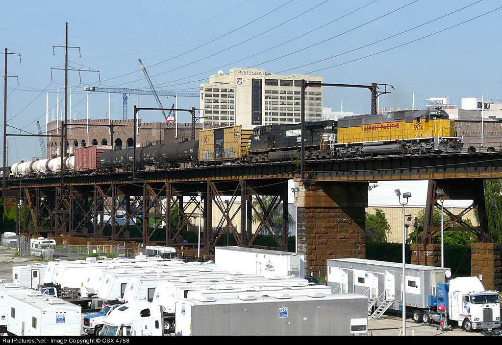 Ex CNW/UP SD60 leaser combines with NS power to haul CSX gen freight Q300 eastbound along the ex Pennsy high line.