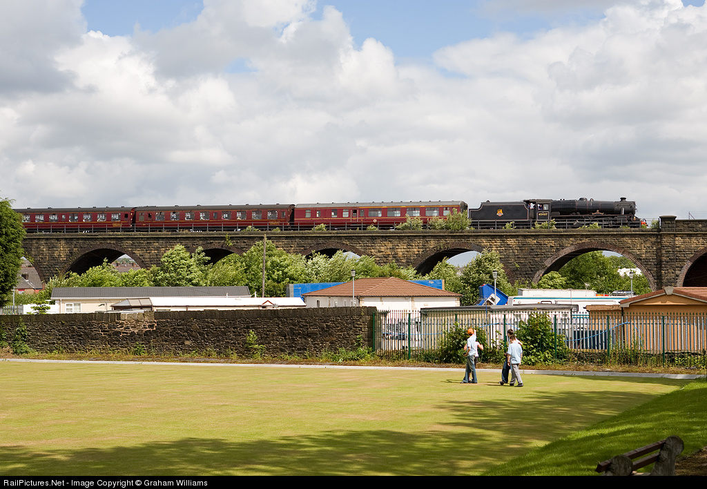 Black Five no. 45407 crosses the viaduct over the River Tonge as it approaches Bolton with The Cotton Mill Express main line special. The children watching in the foreground are on a bowling green. This is how we bowl in the UK, on grass! The grass is as smooth as the base of a pool table.
