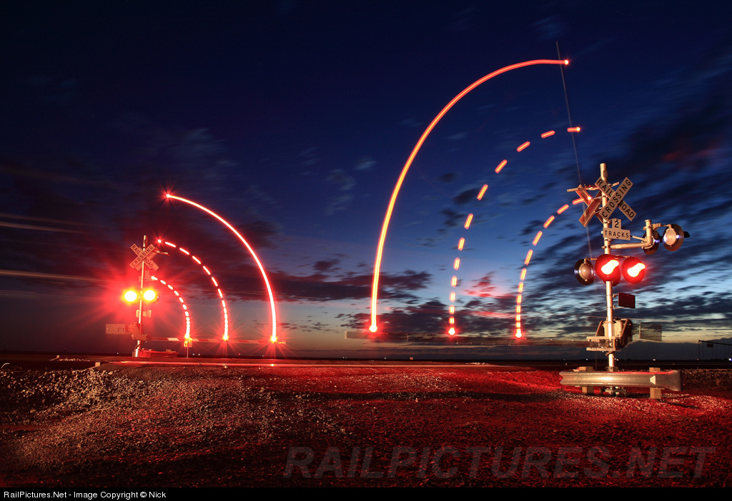 | My first sunrise shot that turned out about as good as I could have asked for. Its 5:30 am and the signals are lined up eastbound movement as this Herzog work train is the first one in the line. The sun is barely starting to creep up over the horizon as the gates do their job. The 30 sec exposure makes it seems more lighter than it really was. |