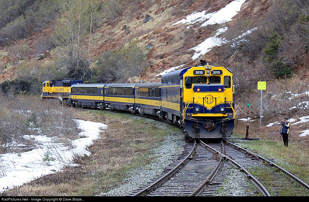 | Deep in the Chugach Mountains on the ARR's remote "tunnel district" veteran Conductor Ron Miller can be seen getting ready to "line behind" to let his train, the regular daily southbound Coastal Classic back out of Tunnel Siding. The short four car "cruise train" is receeding downgrade northbound with a GP40-2 bringing up the rear. This little train is also known as the MEX short for McKinley Express. It is made of three Colorado Railcar built "low level domes" and a "bistro car" made from a former SP gallery commuter coach. One can not buy a ticket on this train unless they are sailing on a cruise ship. All the guests aboard this day disembarked from Holland America's liner Zaandam at the port of Seward and are enroute to the wilderness outpost of Talkeetna. Spring comes late in the mountains of the 49th State.... |