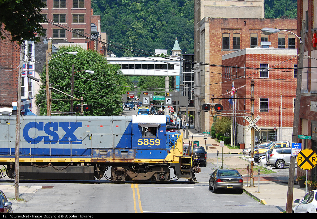 | A day after a derailment in downtown snarled traffic, CSX is again in downtown Johnstown. GE's are rare on the EMD dominated S&C sub, 5859 being pressed into duty due to the derailment, and here it inches across the upper end of Main St. as the lunch hour approaches in the city. |