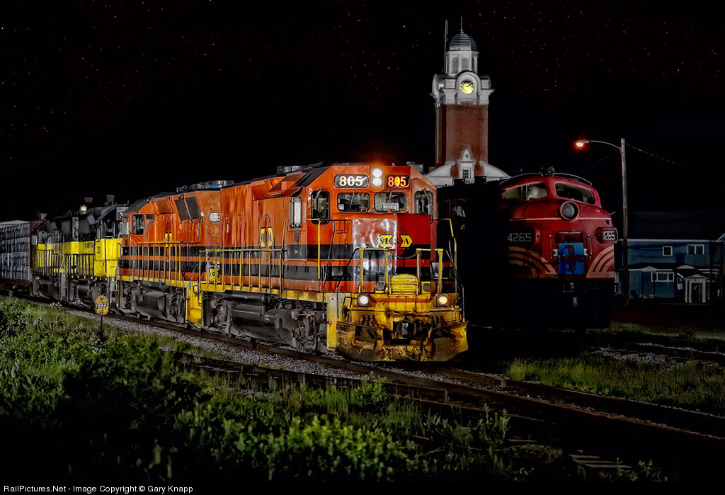 SLR 517 quietly drops downgrade through Gorham behind Road Slug 805, passing under town offices clock tower and preserved ex-B&M F-Unit 4265 at 02:11. Much of 4265's career was spent "up here" working in and out of neighboring Berlin. One of two ex-Southern GP 40X units owned by SLR trails the leader.