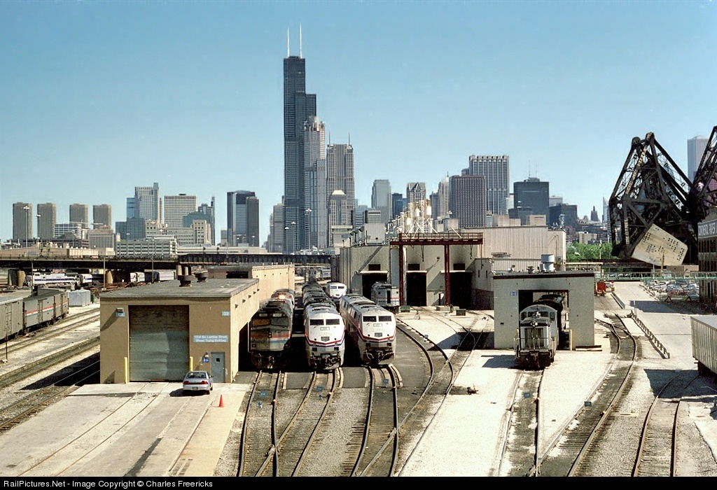 Looking north from the 18th Street ovrpass (at Lumber) we see the Amtrak engine servicing facilities, the St. Charles Air Line viaduct and, to the left, the Canal Street Wye. On the right, is the counterweight of the St. Charles Air Line bascule bridge. In the facility, are some F40PH, P42DC, an NCPU, and a SW10. Off to the left is a Dash 8-32BWH. And behind it all is the western edge of Chicago skyline, dominated by the Sears Tower. This was officially my first time that I used the internet to help me railfan.