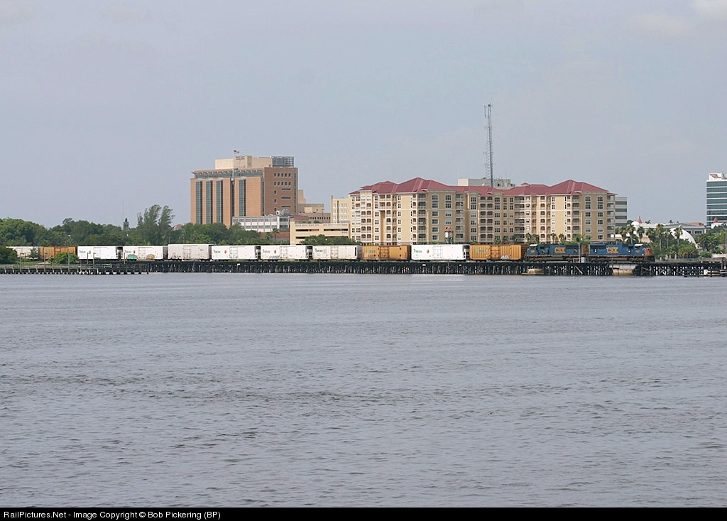 | Tropicana Juice rolls northward out of Bradenton and across the warm tropical waters of the Big Manatee River. I had stepped in a fireant hill and did not know it until about 200 of them were on my shoes. Shoes and socks were quickly kicked off as I aimed at the train. My socks remained in Bradenton. |