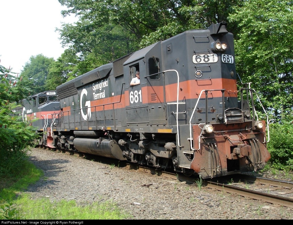 | The sole remaining SD-45 on the Guilford roster along with two other units is in notch 8 pulling westbound traffic bound for CSX out of East Deerfield. The train has just started it's long journey to Rotterdam Junction, near the end of a long day of train chasing. Two years later, the 681 sits in the shops/deadline at Waterville, and now SD-45 rebuilds with 16-645's are takng the place of this original 20-cylinder brute. |