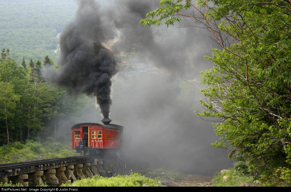 Mountain Climber: Smoke overtakes an upbound Mt Washington Cog train as it pulls up the side of the tallest peak in the east at 6288' in June 2008. Scenes like this could become rare as sitting in the shop was a new John Deere Built locomotive that could replace steam on the mountain.
