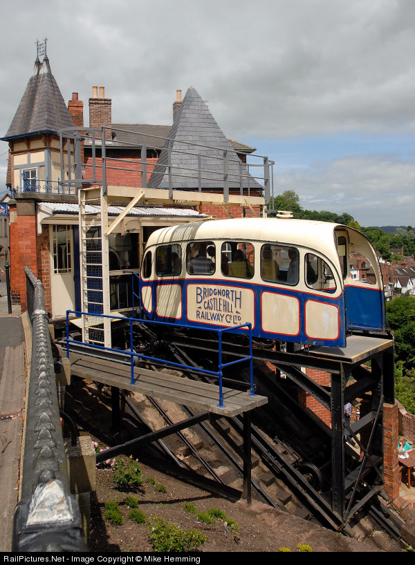 | This shot shows one of two cars that operate on Bridgnorth's Clif Railway from Low Town to High Town climbing 111 feet over a track length of 210 feet. The "up-to-date" cars of aluminum monocoque construction replaced the original wooded construction ones in 1955 |