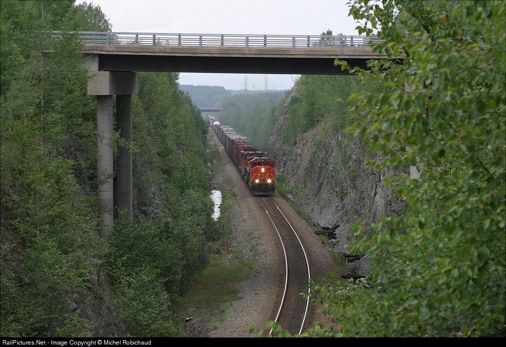 CN 2516 is laboring uphill on the Pelletier Sub. Deep rock cuts have been done in order to keep an acceptable grade.