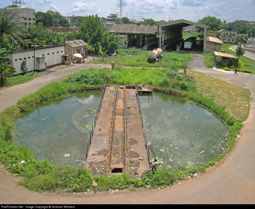 At the engine depot at Kumasi, the second largest city in Ghana (pop. 1.5m) and birthplace of Kofi Annan. There are no trains reaching here these days because the track to Accra and Takoradi is unfit for use and waiting for some foreign investment to restore and upgrade the system. Although not officially closed, the shed looks fairly abandoned, the turntable pit is full of water and the freight cars are isolated by the undergrowth on the rails.