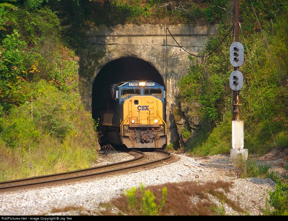 CSX 4789 exits Vance Tunnel after meeting a northbound at Toe River.