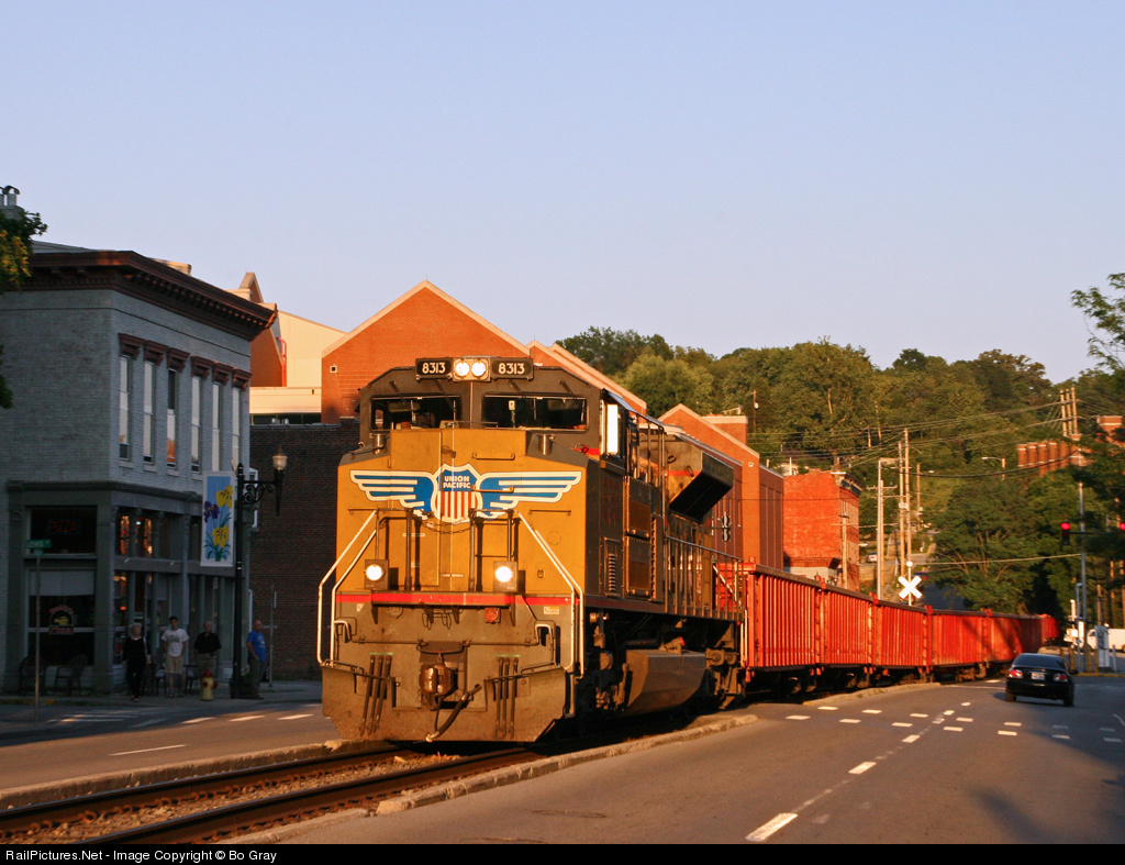 | A rare foreign visitor to these parts, UP #8313 rolls along Broadway in historic downtown Frankfort with a string of empty sand gons as the sun begins to set. RJ Corman is evaluating the performance of this mighty motor. |