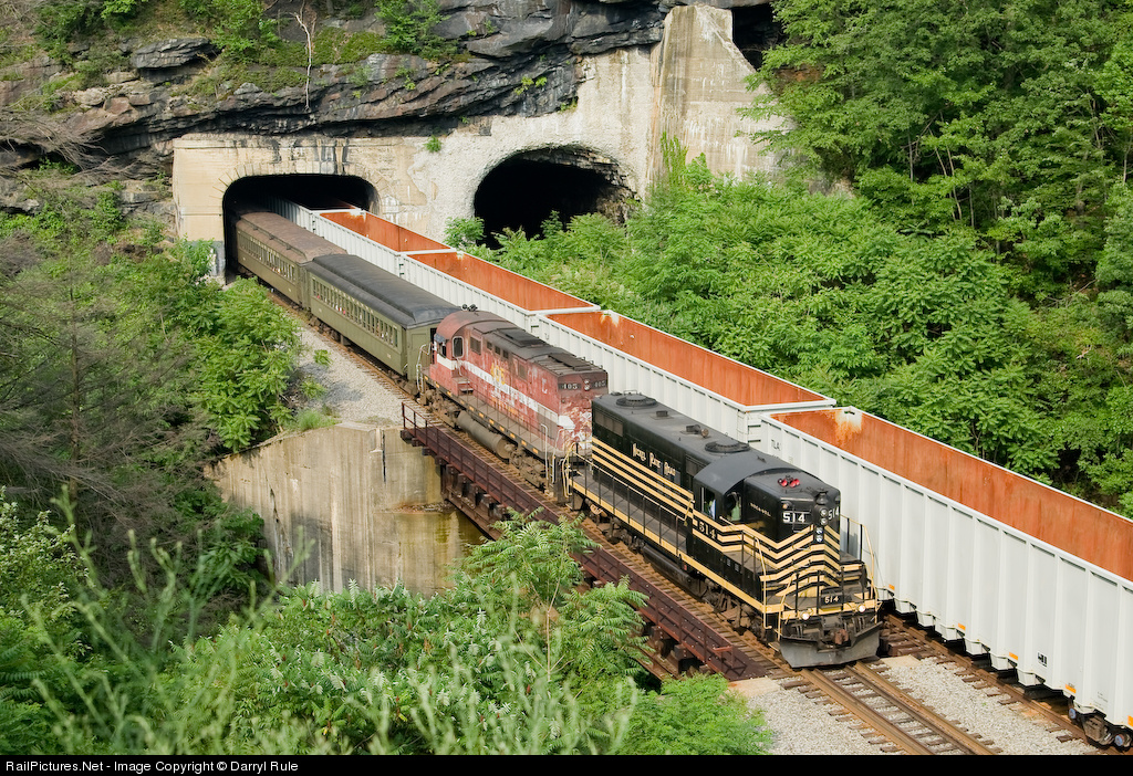 NKP 514 and DL 405 lead the 8 car excursion out of Nay Aug Tunnel near the end of a very successful excursion.