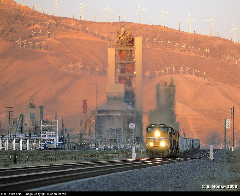 The Sun has just dipped below the mountains behind me, but the top of the Monolith cement plant and opposite mountainsides are still bathed in evening light. UP 5959 is leading a short cement train up the grade, approaching Summit.