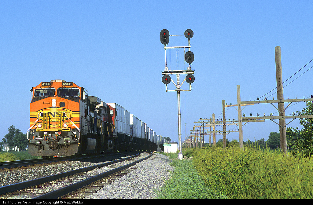 Eastbound NS 218 passes an ex NKP bracket mast at the west end Payne siding. Today the bracket mast is replaced with modern signals and all of the railroad pole line has been taken down.