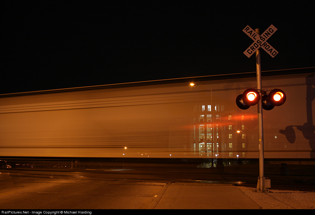 | On a warm summer night, NS 9782 led a yard job dragging grain loads down the Clinton Industrial track which runs through the middle of the University of Toledo main campus. Brightly lit university buildings shine through in this time exposure. |