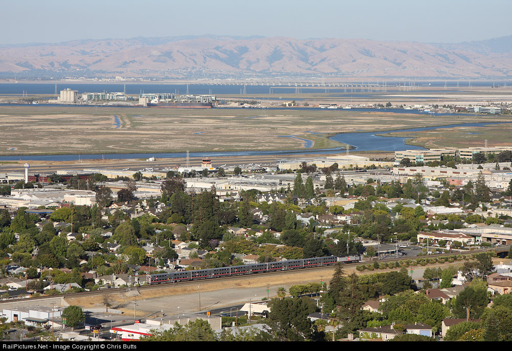 A northbound CalTrain commuter is seen from the hills above San Carlos. In the background is the port of Redwood City, San Francisco Bay, and the highway 84 and ex-SP Dumbarton bridges.