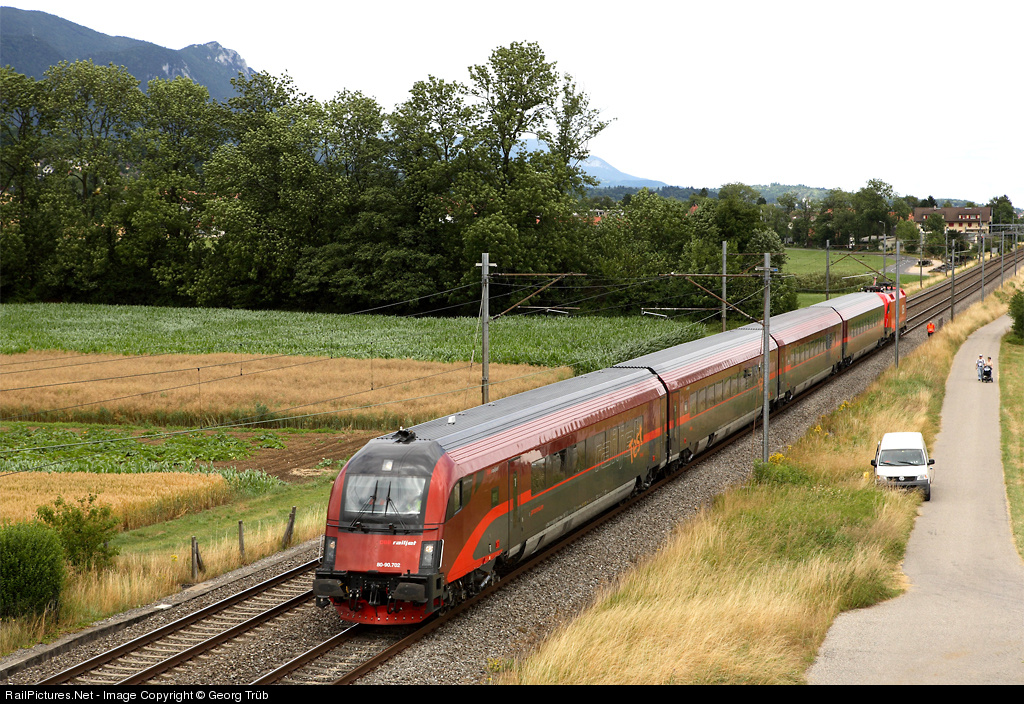 One of the new "RailJet" pushpull trainsets of the Austrian Railways made test runs in Switzerland, here for the interplay of overhead wire and pantograph. The "RailJets" will begin service between Austria and Switzerland late in 2009, then with 7 cars (including cab car) and a "Taurus" locomotive.