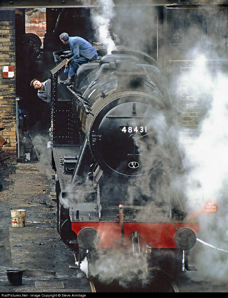| Conversation piece at Haworth Motive Power Depot. It is to be hoped that the safety valves do not lift! Almost seven hundred '8F's' saw service in the UK and many more were shipped to Europe and the Middle East during WW2. Many contractors were involved in their construction from 1935 onwards and 48431 is a Swindon-built example from 1944. |