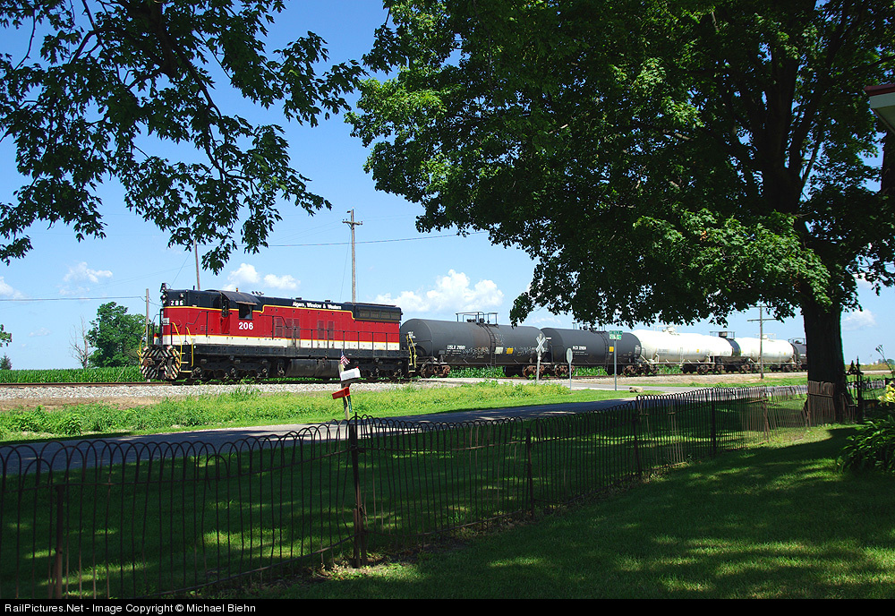 | Former Algers, Winslow, and Western SD9 pulls a short string of tank cars to Fernald, Ohio. |
