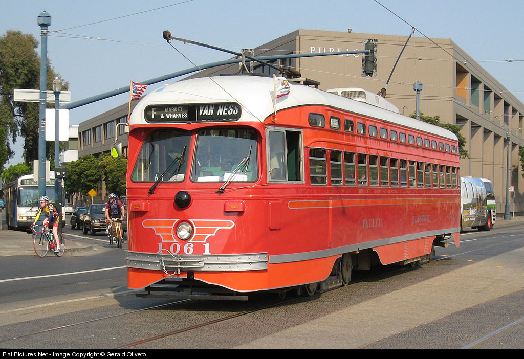 Painted to honor Pacific Electric, this PCC car was built in 1948 for the Philadelphia Transportation Company, where it operated until 1989. Formerly SEPTA no. 2116, it was acquired by MUNI in 1992, overhauled in 1994, and began operation on the F Line in 1995.