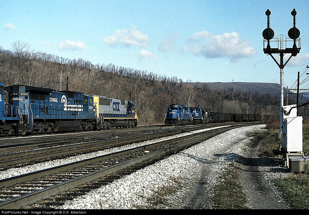 The "split" isn't coming for seven more years but you wouldn't know it here. A CSX e/b coal train enters Cumberland yard with CR SD40-2 6442 on the head end, followed by a C40-8W and a NS unit, while a CSX w/b waits to leave the yard with SD50 8594, CR C39-8 6004, and a CR SD40-2.