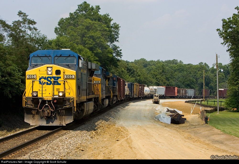NS 12R is westbound on the B-Line, at Belvoir with 3 CSX units for power. One AC6000CW #665, and two AC4400CW's numbers 598 and 414. (** Note: NS has begun grading this area, prior to laying a second track, in order to eventually double track the B-Lin