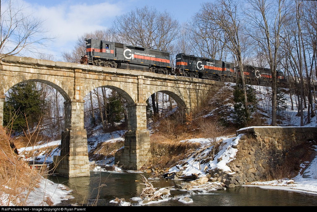 | MEC 376 leads the weekly Slurry train, BFPO, over the stone viaduct spanning the Green River. This train no longer traverses the Conn River Line and is now handed off from the Vermont Railway to the GRS at the newly revitalized interchange at Hoosic Jct NY. |