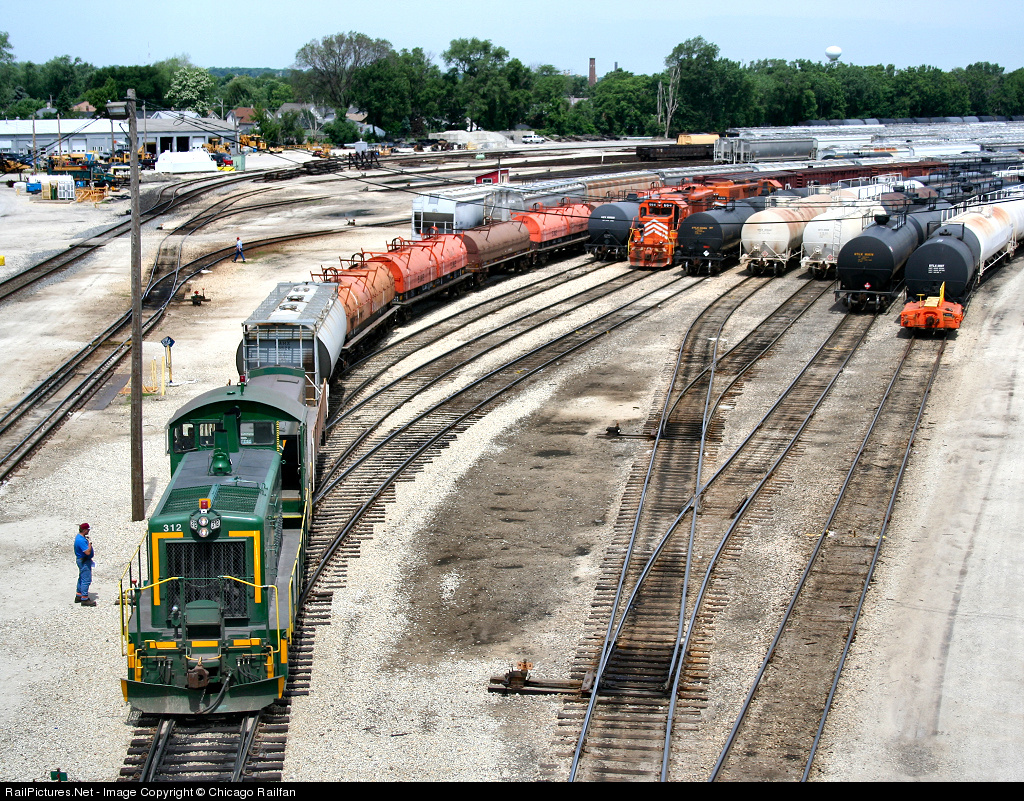 | EJ&E 312 and T-2 switch cars around the EJ&E yard. Note to the right, a very rare test car, EJ&E #003! |