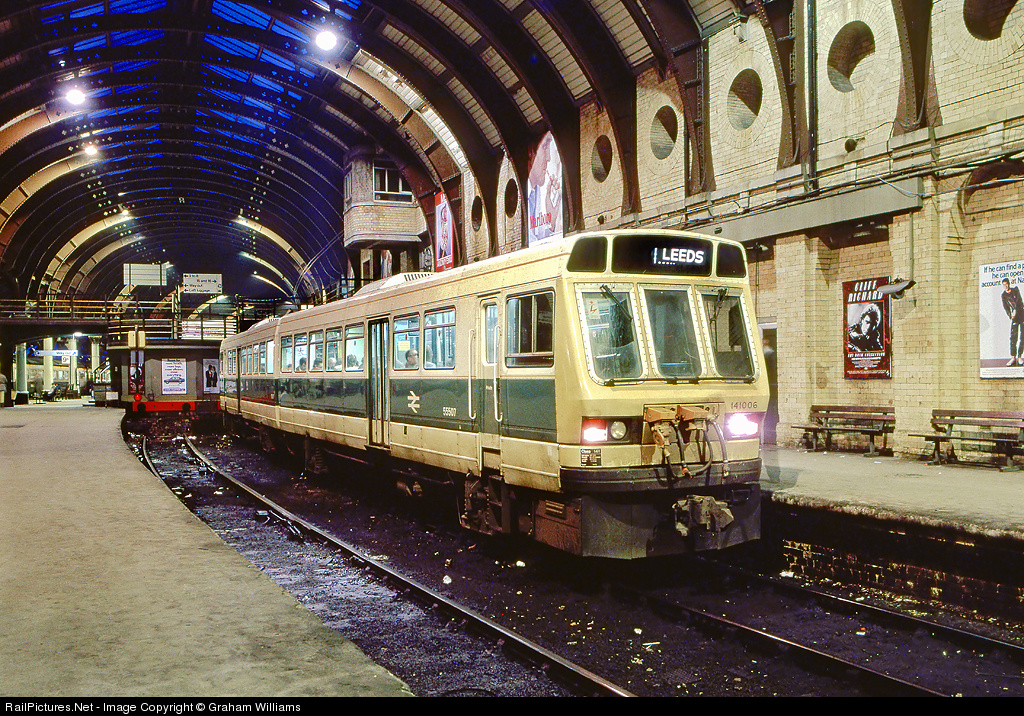 An old shot from 1984. 141 006 waits in the evening in a bay platform at York with a service to Leeds, via Harrogate. The Class 141 was the first production model of the Pacer diesel multiple units.