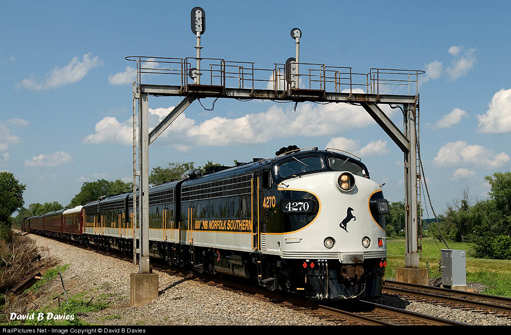 | Southern inspired NS 4270 leads a deadhead 955 southbound under a Southern signal bridge at Winston, VA. |