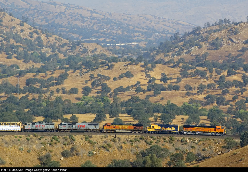 | BNSF 7409 leads an interesting consist around the loop. Included is BNSF 2953 (ex-ATSF GP39-2), TFM 1622 (SD70MAC) and KCS 2912 (GP40-2LW). In the distance a UP southbound at Rowen can be seen making its way toward the loop. |