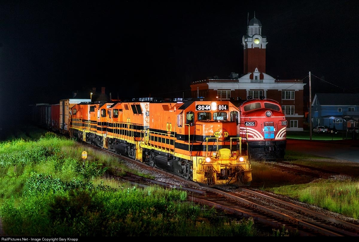 Shot from the basket of a cherrypicker, road slug 804 leads SLR 517 downgrade through Gorham passing the ex-B&M 4265 with the town office clock tower in the background at 02:48. I always wanted to go up in one of these at night. What a view!