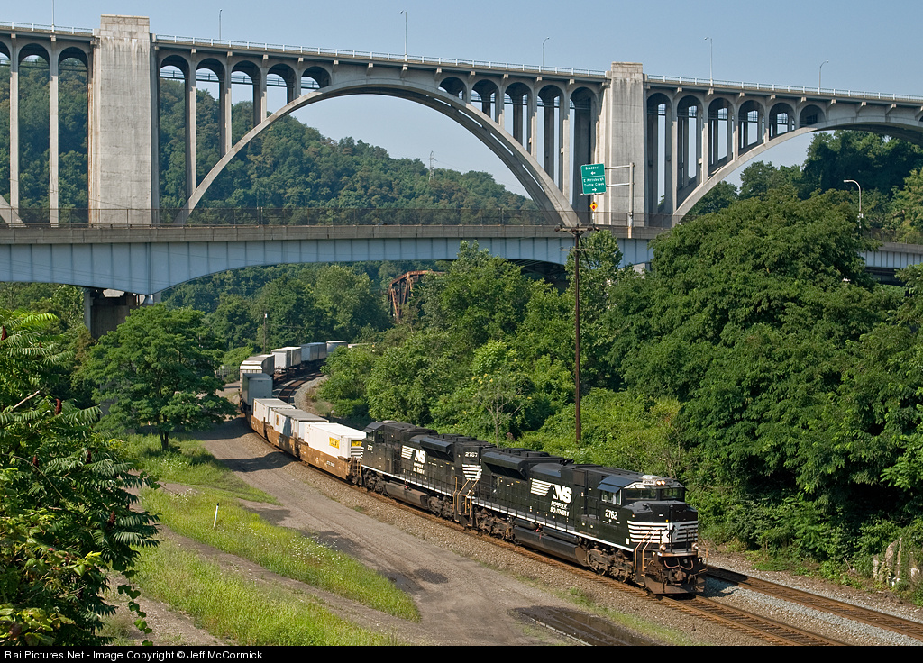 | NS 2762 heads east after passing under the Union Railroad Bridge, the Westinghouse Bridge, and the Triboro Expressway Bridge; in that order. |