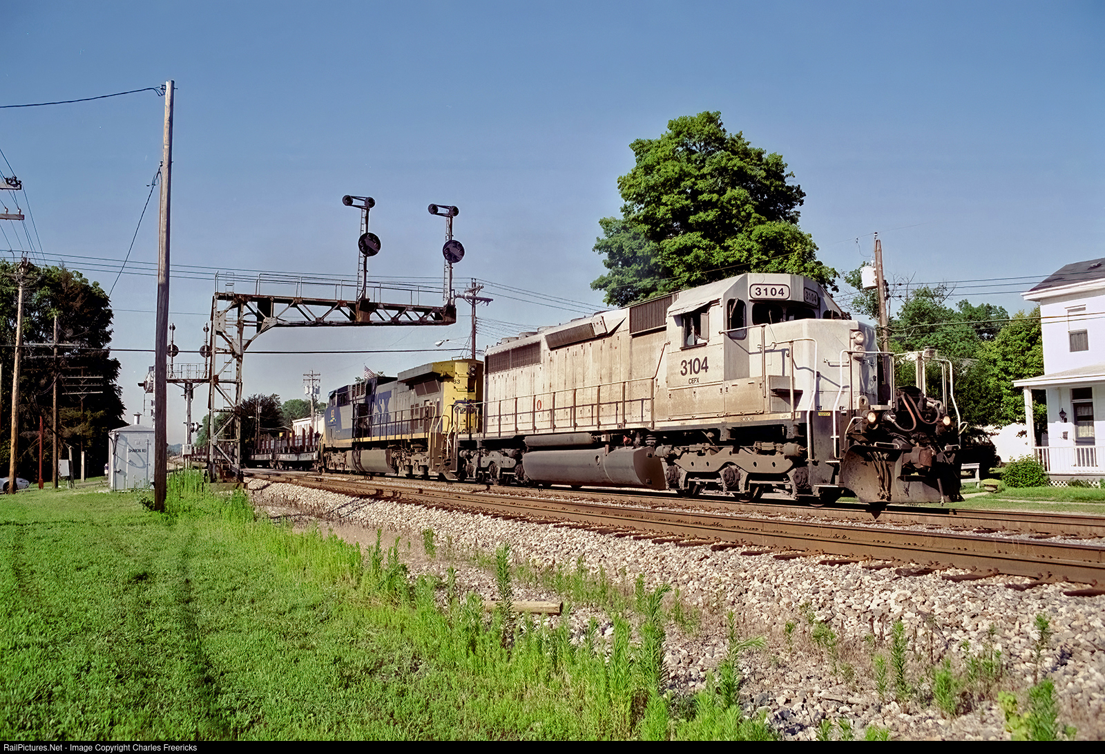 The daily steel train from Ashland, Kentucky (AK Steel) to Middletown, Ohio (AK Steel) passes under a CPL cantilever in the Cincinnati suburb of Glendale, Ohio. The lead unit, CIT Equipment #3104 was delivered to the Canadian Pacific by GMD in December of 1966 as their #5531 (the last unit in an order of 32). Sold to East Coast Motive Power in August of 2000, it was then sold to and rebuilt by Alstom for CIT as CEFX #3104 (an SD40-2M).