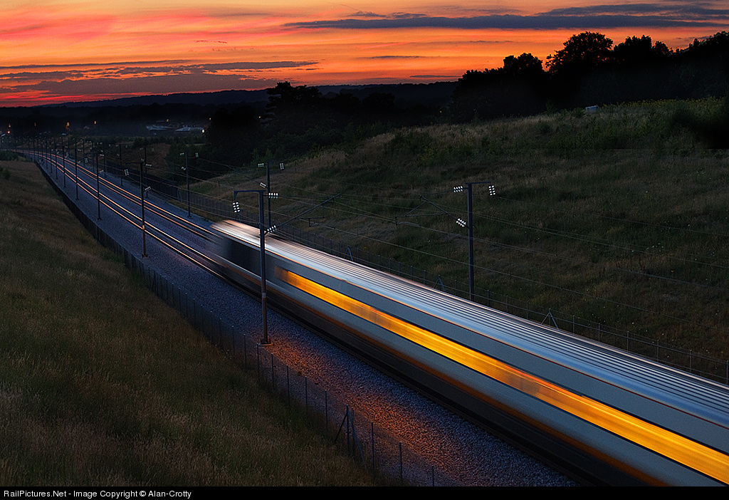 Shortly after sunset the last up Eurostar of the day from Brussels to London St Pancras rushes past Runham Lane at 180mph.