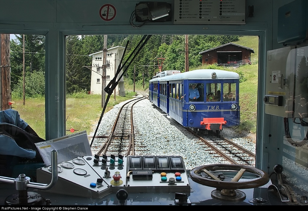 | While the driver is out of his cab to exchange tokens, an ascending train on the Mont Blanc tramway enters the passing loop and station at the Col de Voza |