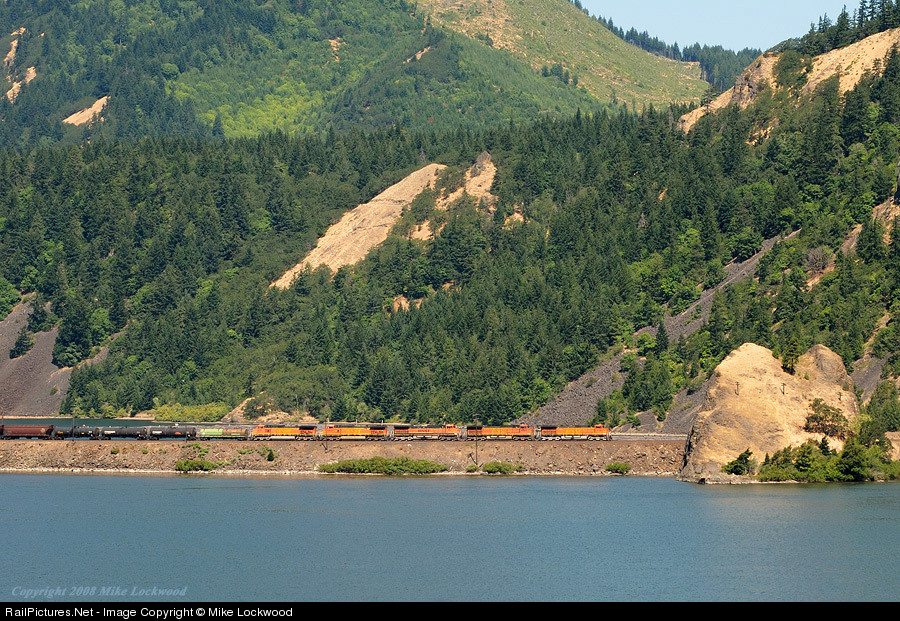 Rolling up the Columbia River Gorge, a BNSF eastboud passes Drano Lake and is about to enter a short tunnel just west of Hood, Washington. After waiting for what seemed like an eternity for anything to show up, this BNSF freight arrives as a meet between two UP freights takes place infront of me. I was hurredly switching from by tripod mounted 300mm and my 50mm lenses to shoot both; when it rains, it pours. To see the UP freights, click here. 1132hrs.