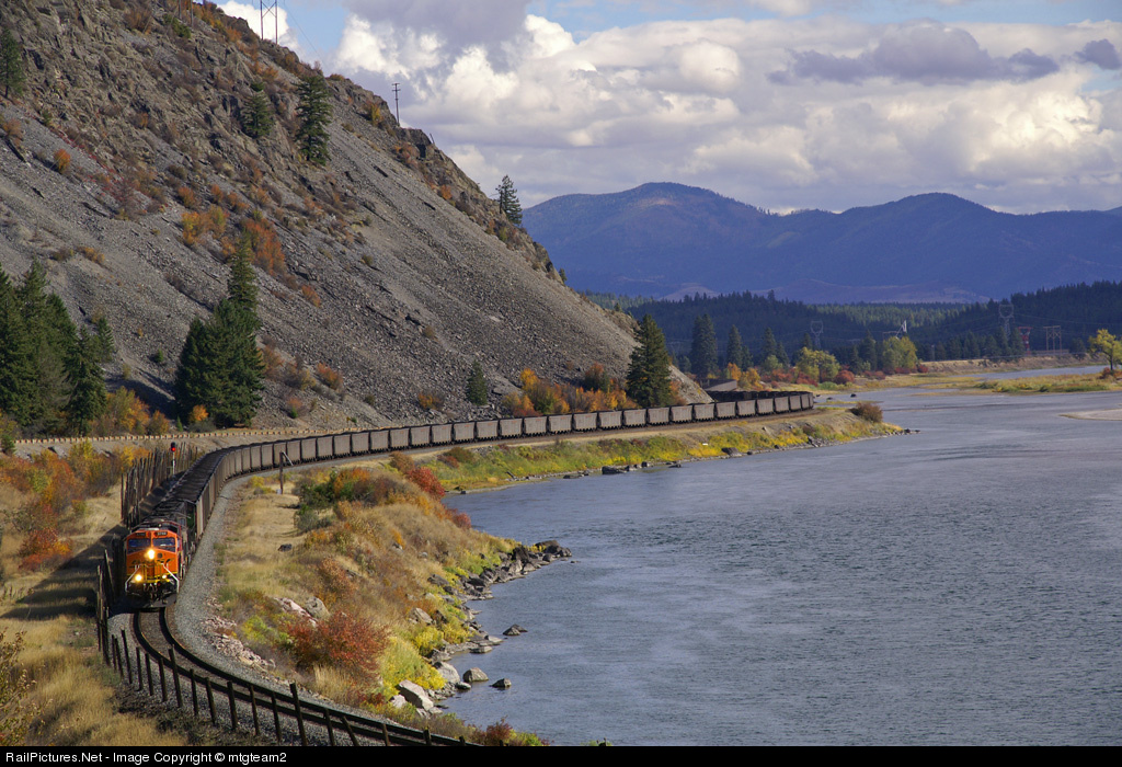 A coal train follows the contours of the Clark Fork River near Eddy Montana