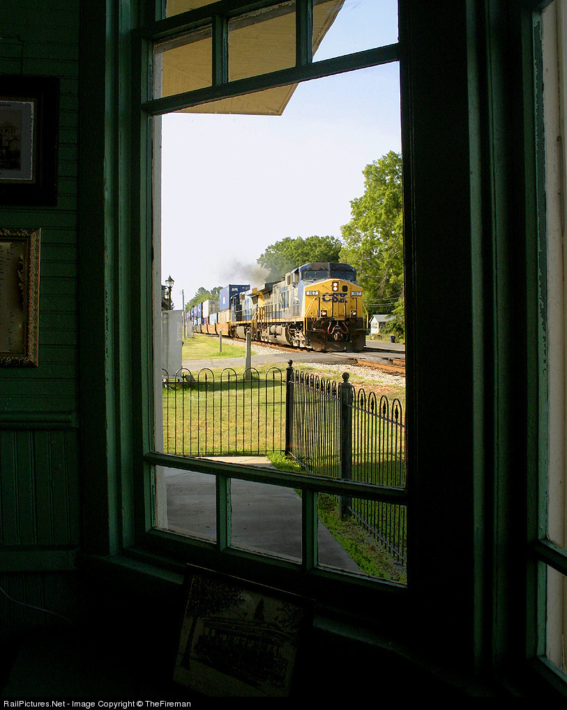 A N/B I-modal as seen through the station agents window in the restored depot in Adairsville, Georgia.