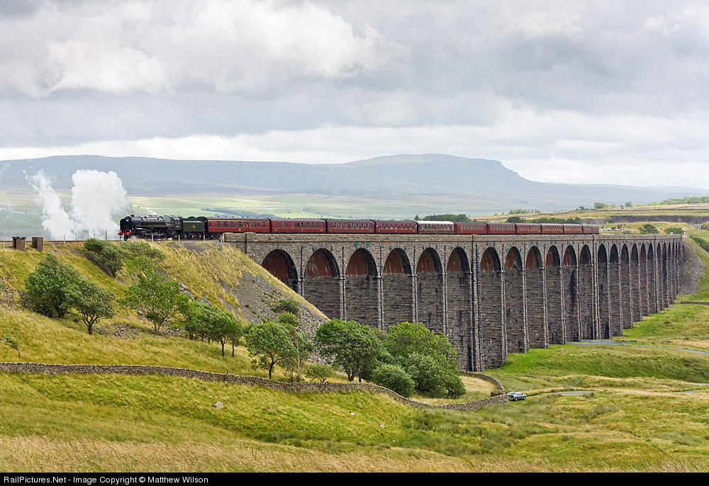 | 70013 accelerates off the legendary Ribblehead Viaduct with a 40th Anniversary special to replicate the original Fifteen Guinea Special. This loco featured on the same leg of the original tour 40 years previous |