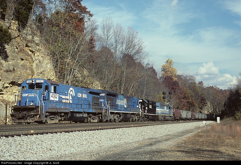 Westbound empty hoppers with two ex-CR units (B23-7 4082 and C30-7 8097) and some leased power. Older GEs inherited from Conrail did not last long on NS.
