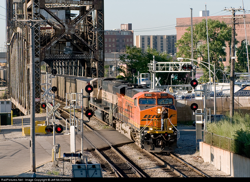 | As BNSF 6185 passes the Lumber Street crossing heading toward Chicago, the conductor is seen taking a picture of the city skyline which is behind me. |