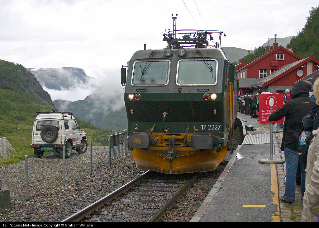 | 17 2227 arrives at Myrdal with a Flam Railway service from Flam. This amazing journey is definitely one of the most scenic in the world. Despite being the middle of August, the height of over 2800 ft made it decidedly chilly. Low cloud made the journey very atmospheric as the train passed through the cloud as it dropped down to sea level in 12.5 miles and with inclines of up to 1 in 18! |