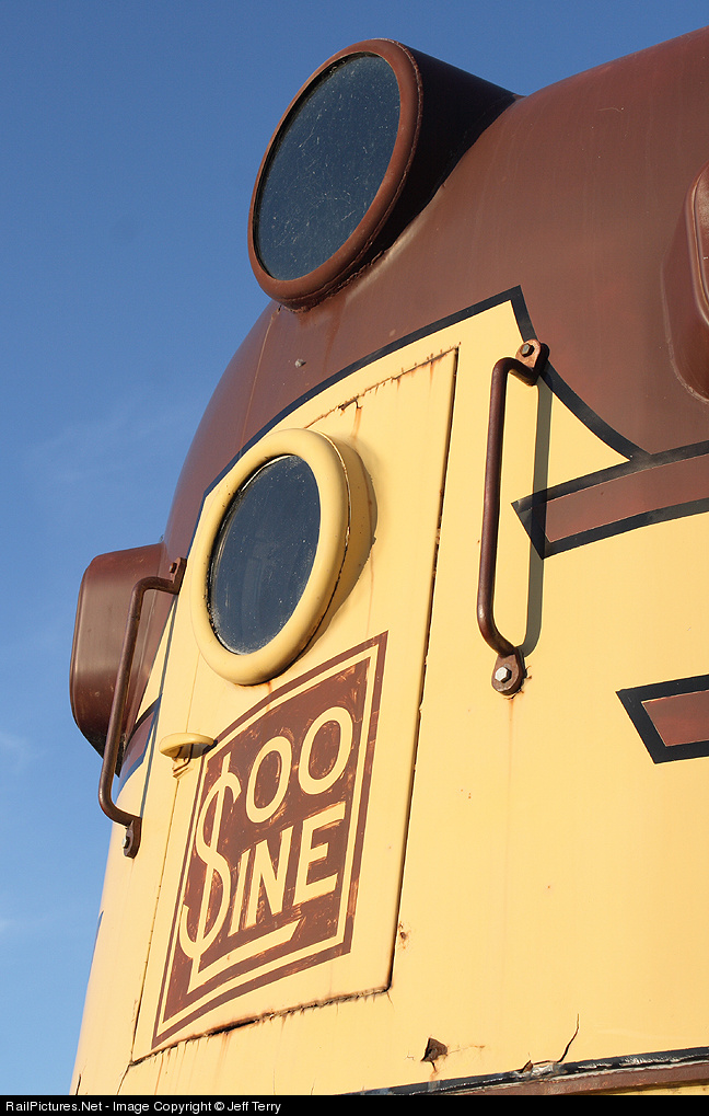 | The faded Soo Line herald on the nose of FP7 No. 500, on display alongside the old Soo Line main in Ladysmith, Wisconsin. |