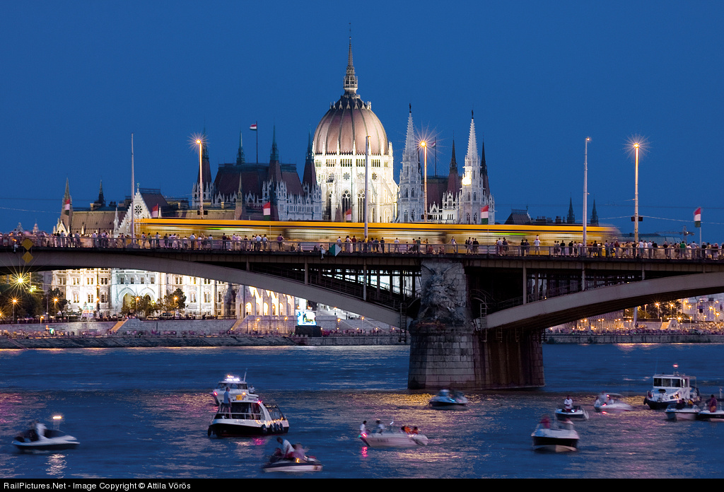 The last tram is passing over the river Danube before the firework starts at the Hungarian national feast on state-founding.