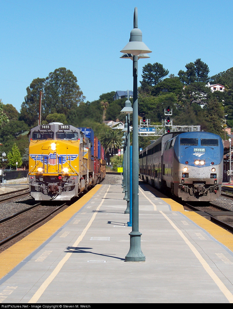 | Exact quote from BigHarv Dispatcher 62 (Who should be named Tiny after seeing he's lost 40 pounds!) talking to AMTK 713 pulling into Martinez this afternoon, with the IG2OA on #1. AMTK167 leads #713, and UP7855 leads the 79-car stacker with a rare DPU on |