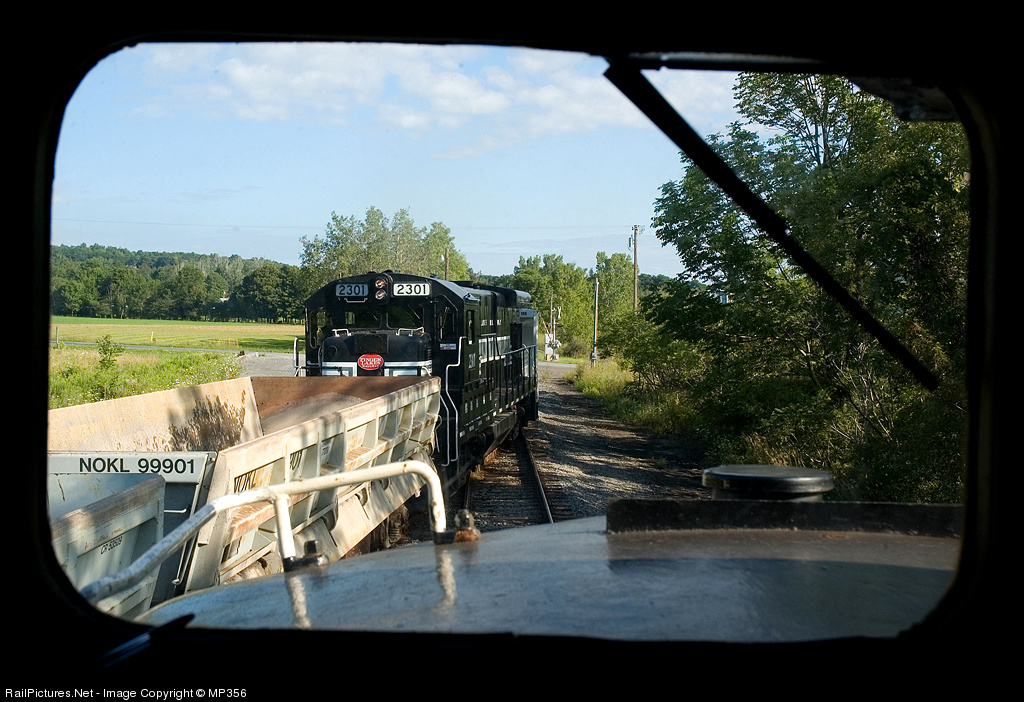 | As seen from the cab of FGLK 2305, the crew of GW2 waits for FGLK 2301 to finish drilling a string of side dump cars at the north end of Himrod Yard. GW2 will then pick up its train and head for Watkins Glen. Taken with permission. |